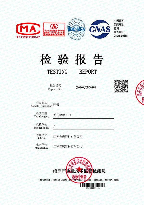江蘇吉慶管材集團有限公司創(chuàng)辦于2010年2月,是pp管,pp管材,pp管件,pp風管,frpp管,frpp管材,pph管,pph管材,pph管件,pph風管,pvdf管,pvdf管材,pp儲罐,pp板材的專業(yè)化生產企業(yè)。公司占地30余畝,擁有各類資產8000余萬元,專業(yè)技術人員20余人,管材生產線10條,管件生產線11條,具備了10000余噸各類防腐塑料制品的年生產能力。公司通過了ISO9001-2000質量體系認證,同時被評為AAA信用單位,2018年公司被評為高新技術企業(yè),此后陸續(xù)取得安全生產管理證書等榮譽。公司位于水上花園城市----江蘇省揚中市八橋鎮(zhèn)永福路18號,交通便捷,可直接導航至公司園區(qū)內。公司全體員工將以高度的敬業(yè)精神,嚴格的質量控制理念和科學的管理方法,及時周到的服務,竭力為我國塑料管道在各領域的推廣和應用作出更大的貢獻!